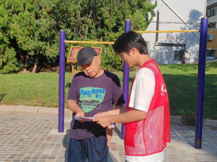 8月8日清晨,陽光灑在安和社區(qū)的小徑上。志愿者們身著統(tǒng)一的紅色實(shí)踐馬甲,帶著滿懷熱忱,奔赴社區(qū)各個角落。在社區(qū)廣場、居民樓前,大家主動與居民交流。面對志愿者,居民們紛紛投來好奇與期待的目光,有的熱情打招呼,有的主動圍攏過來,一場知識傳遞的旅程正式開啟。