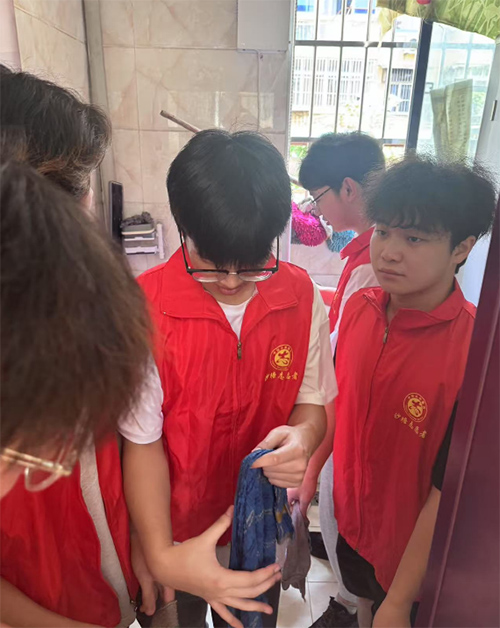 實踐首日,團隊便投身社區環境整治。在社區廣場,成員們分工明確:有的手持掃帚,清掃路面落葉與煙頭;有的拎著水桶抹布,擦拭健身器材、座椅等公共設施。看似常規的清潔工作,他們卻做得格外認真。