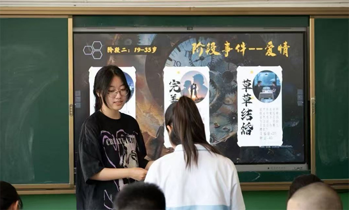 四、選擇與啟示:侯文佩的“人生模擬器” “假如人生重來,你會如何選擇?”侯文佩老師設計了一場沉浸式的“人生模擬”游戲。通過“抽卡獲取初始屬性”、“自主決策觸發事件”、“屬性實時變動記錄”等機制,學生不再是聽眾,而是自己人生的深度參與者。隨機的“出身”骰子無法改變,但講臺上已響起稚氣卻堅定的宣言:“我要成為資本!”游戲中,學生們體驗著天賦覺醒、勤學苦讀或摸魚偷懶帶來的不同軌跡,深刻理解了在“時間、財富、幸福”間權衡取舍的必要性,探索了“事業與情感”的平衡之道,并反思了人生全程選擇對晚年狀態的長遠影響。侯老師更以錢學森、吳亦凡、張桂梅三人迥異的人生軌跡為例,生動闡釋了關鍵選擇對命運的塑造力。游戲結束時,學生們興致勃勃地分享各自的“人生”走向。侯老師總結道:“游戲中,運氣是彩蛋;現實中,選擇是刀鋒。人生的重啟鍵并不存在,但我們可以堅持方向,在命運的岔路口,學會審慎落筆,走好每一步。”這堂模擬課,是一次關于責任與智慧的深刻預演。