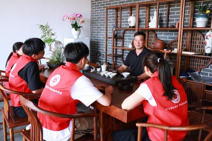 在生機勃勃的鴻鼎農場,實踐隊與2023年“福建省勞動模范”、漳平臺商聯誼會會長李志鴻先生圍坐暢談。訪談中,李志鴻深情回顧了自己扎根大陸二十余載,心無旁騖專注高山烏龍茶種植與加工的創業歷程。如今,鴻鼎農場已成長為兩岸規模領先的現代化高山烏龍茶生產基地,其以匠心培育的茶葉憑借卓越品質廣受市場青睞。隊員們在他的講述中,深切體會到臺商在大陸創業的滿腔熱忱與執著堅守,更直觀領略到兩岸農業產業深度融合所孕育的蓬勃機遇與累累碩果。