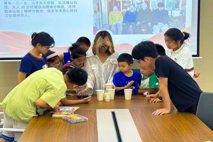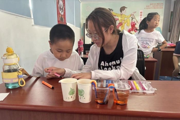 隊員張懷冉為孩子們演示酸堿指示劑調色實驗 唐雨虹攝