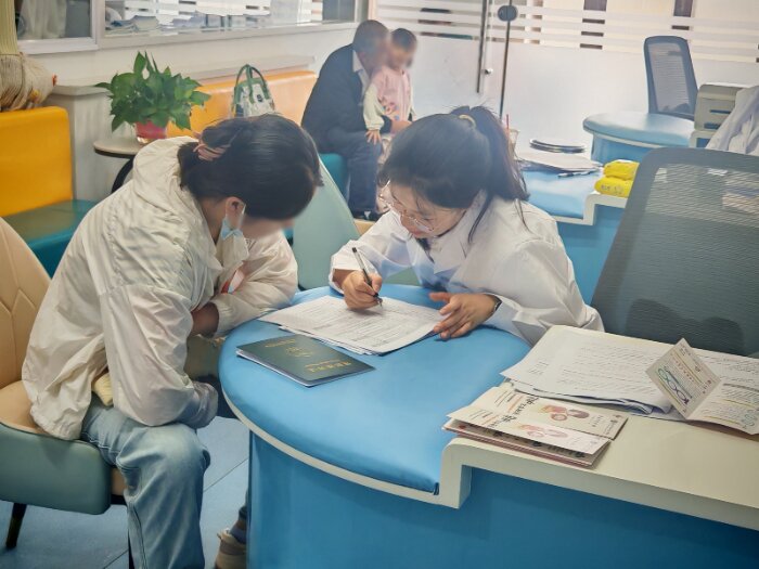 (圖為實踐團隊成員在武威社區指導陪孩子接種的母親填寫問卷。蘭心育未來實踐團隊供圖)