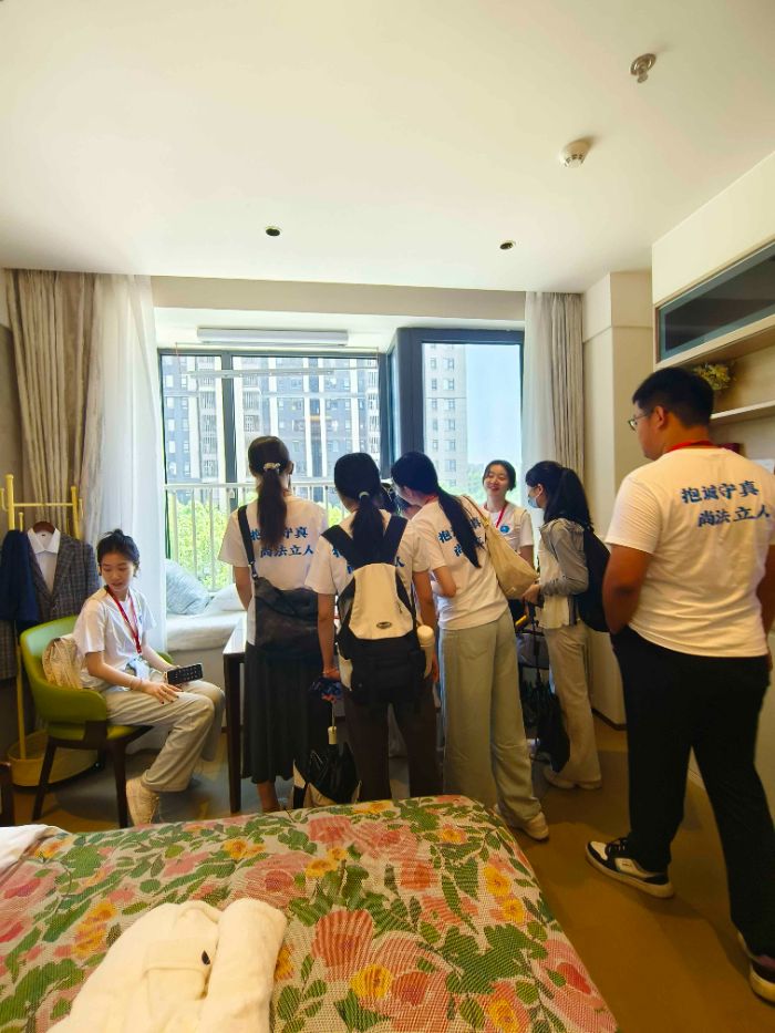 清晨,隊員們精神抖擻,攜帶精心設計的《老年人法治意識與養老需求調查問卷》和《民法典》普法手冊,在帶隊老師的囑托下出發。“走進養老機構,不僅要傳遞法律知識,更要傾聽長者心聲,用法治視角觀察現代養老服務的實踐,思考如何讓法律更好地服務‘夕陽紅’。”領隊陳老師在行前動員中如是強調。目標泰康甬園之家——這座位于鄞州區,以“醫養結合、活力養老、文化養老”為特色的高品質養老社區,成為隊員們探索“法治+養老”融合路徑的生動課堂。