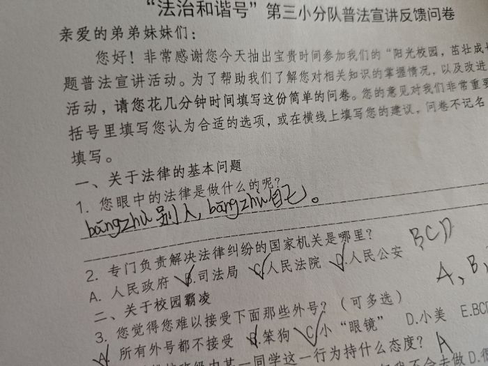 為精準了解孩子們的想法和需求,團隊設計了互動問卷:詢問孩子眼中的法律是做什么的?如果遇到校園霸凌,會選擇向老師反應嗎?以及本次宣講后了解校園霸凌了嗎?