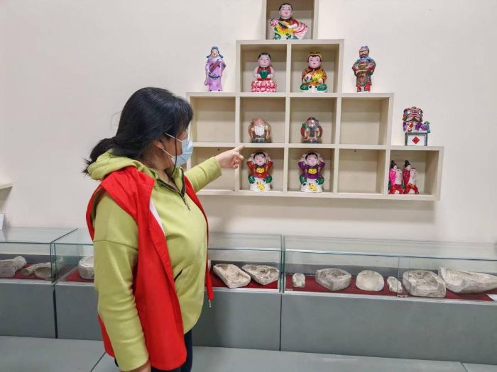在泥塑展臺前,各類泥塑作品散發著泥土的質樸氣息。工作人員向實踐隊員們介紹,這些泥塑從選土、捏制到彩繪,皆為手工完成,匠人們巧手塑造出神話人物、家畜家禽等造型,每一處紋理、每一抹色彩都傾注心血,生動反映當地農耕生活與民間信仰,是地域文化鮮活的“代言人”。這些泥塑造型各異,充滿了生活氣息,從傳統的神話人物到現代的生活場景,無不展現出民間藝人對生活的熱愛和對藝術的執著追求。實踐隊員們通過與文化館工作人員的交流,深入了解到了泥塑的制作流程和技巧,對這一非遺項目有了更深入的認識。