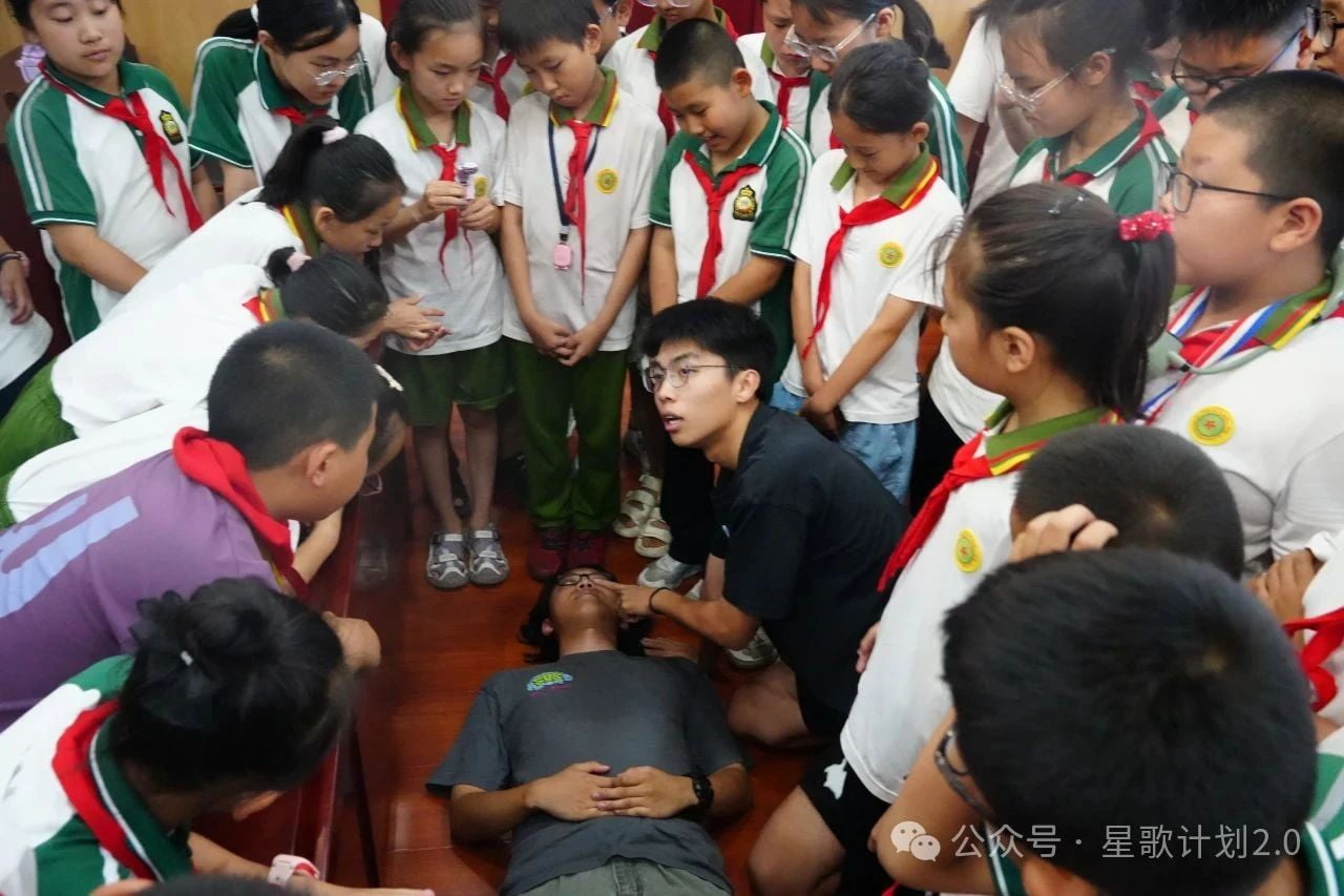 圖為老師正在進行海姆立克急救演示。 康佳瑋 供圖 人生曠野,星歌護航。周末,團隊帶領同學們開展校外實踐,在礦區賽魚公園進行攝影實踐、美術拓印和團體活動等,擁抱大自然,更在實踐中學習、在游戲中成長。