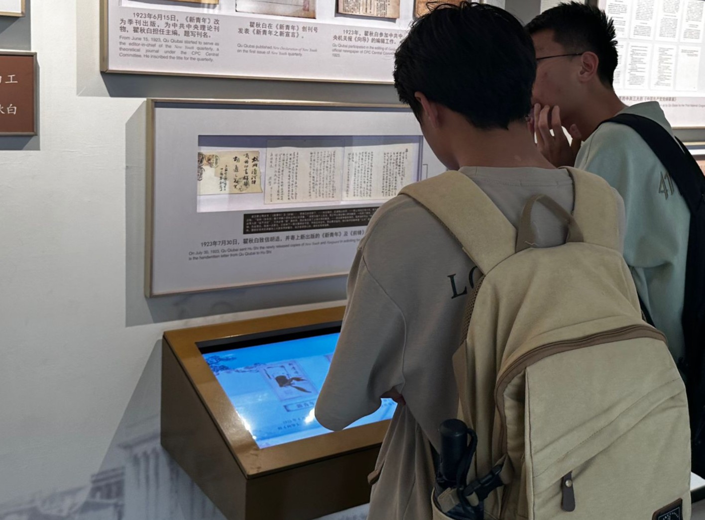 在莊嚴肅穆的瞿秋白紀念館內,實踐團成員懷著崇敬的心情,通過詳實的史料、珍貴的文物與生動的影像,全方位、多角度地重溫了瞿秋白同志光輝而短暫的一生。大家并未止步于走馬觀花式的參觀,而是重點圍繞瞿秋白同志的理論貢獻、革命意志和文學成就等內容展開了深度學習與探討。尤其是在陳列著《多余的話》手稿的展柜前,成員們駐足良久,輕聲誦讀著“中國的豆腐也是很好吃的東西,世界第一”等樸實而飽含深情的文字,深刻體會到一位革命者在生死考驗面前的從容、樂觀與對腳下土地的無限熱愛。整個過程中,同學們時而凝神聆聽講解,時而低聲交流感悟,將書本中抽象的“革命精神”轉化為眼前具象的感動與震撼,完成了一次深刻的靈魂觸動與精神洗禮。