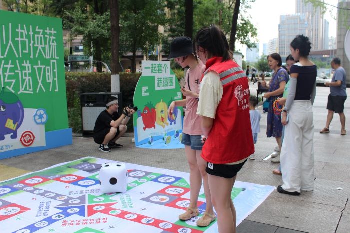 本次活動一共四個環節,用廢棄書本來換取集印章卡片,通過垃圾飛行棋,墊排球,套蔬圈,知識問答來集齊四枚印章即可換取蔬菜和多肉小盆栽。