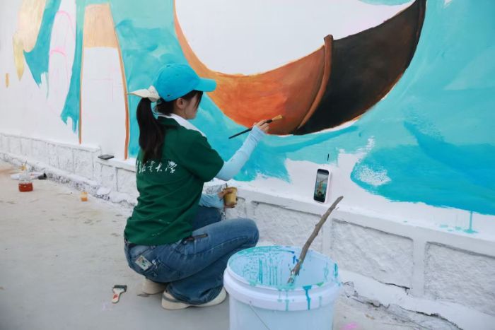 圖為隊(duì)員們進(jìn)行墻繪填色工作。魏佳 供圖