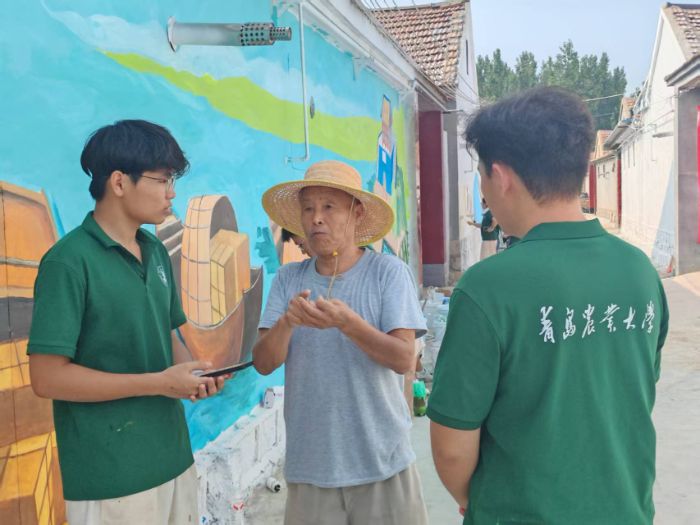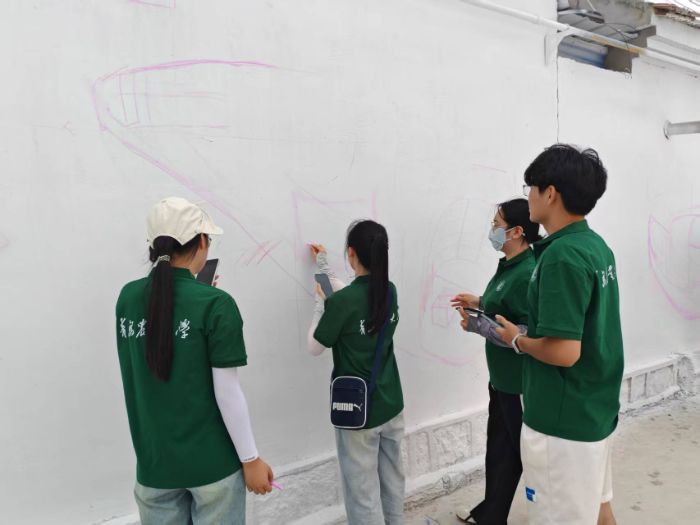 活動(dòng)過程中,團(tuán)隊(duì)與當(dāng)?shù)攸h員、村民深度聯(lián)動(dòng):走進(jìn)黨員王合平家中聆聽歷史回響,與村鎮(zhèn)書記共同商議墻繪方案,向村民征求創(chuàng)作意見……從粉筆起稿、調(diào)色暈染到細(xì)節(jié)打磨,每一筆都凝聚著校地協(xié)作的心血。值得一提的是,隊(duì)員們還向村民展示了墻繪AR技術(shù),讓靜態(tài)畫作與數(shù)字科技碰撞出奇妙火花,為傳統(tǒng)文化傳播注入現(xiàn)代活力。