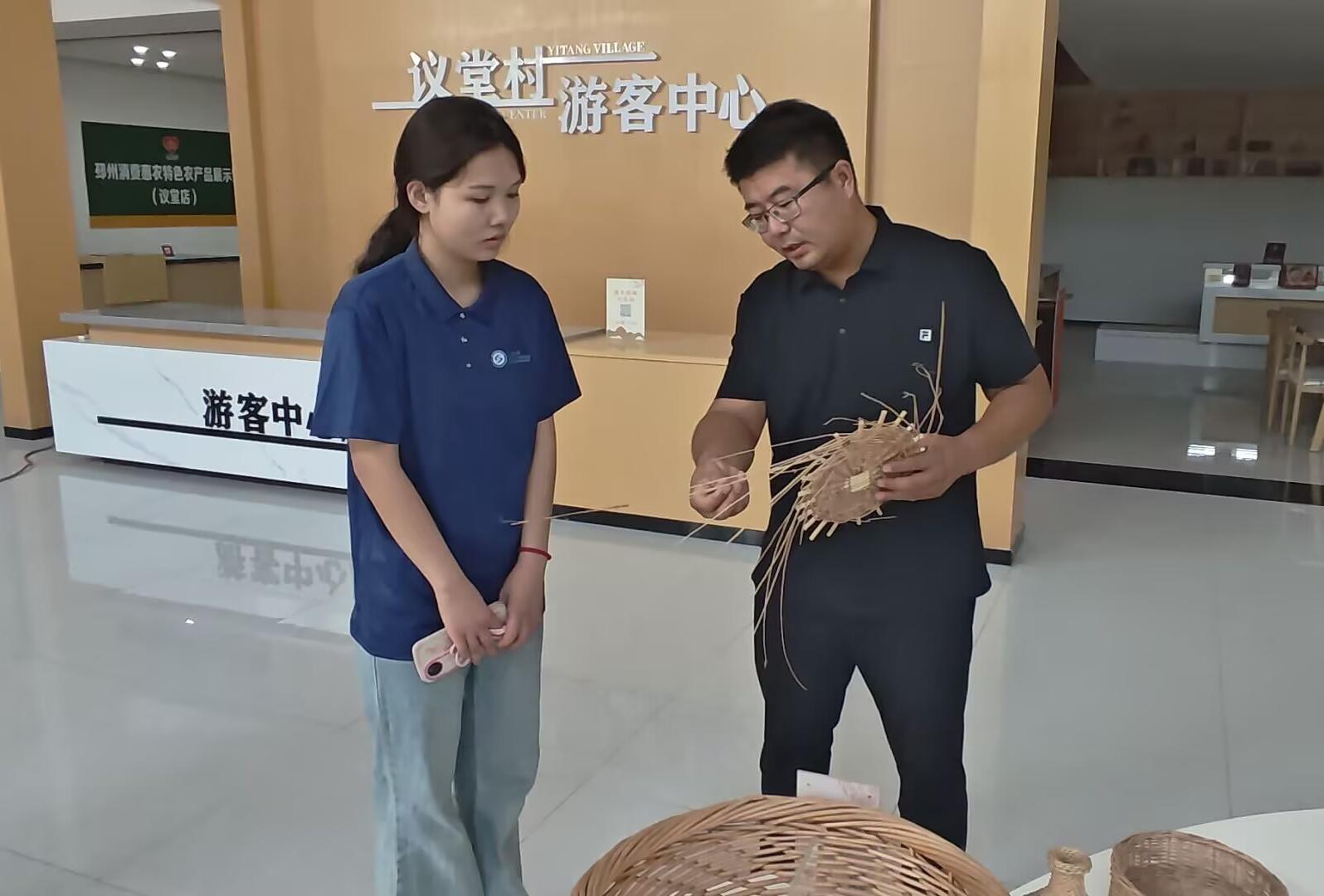 "議堂之窗" 紅色議事堂內(nèi),抗戰(zhàn)時(shí)期的手推車、泛黃的路線圖承載著戰(zhàn)火紛飛的崢嶸歲月,墻上新舊對(duì)比的村莊照片則清晰展現(xiàn)出村莊從舊貌到新顏的巨大蛻變。姜欣一邊認(rèn)真記錄,一邊說(shuō)道:"老物件里蘊(yùn)含著濃得化不開(kāi)的鄉(xiāng)愁,新變化里滿是奮勇向前的勁頭。" 在農(nóng)產(chǎn)品展示館,隊(duì)員們了解到村里通過(guò)發(fā)展柳編工藝、紅色旅游等特色產(chǎn)業(yè)帶動(dòng)村民增收致富,"產(chǎn)業(yè)振興是鄉(xiāng)村振興的關(guān)鍵所在。" 村黨支部書(shū)記李坤介紹道。