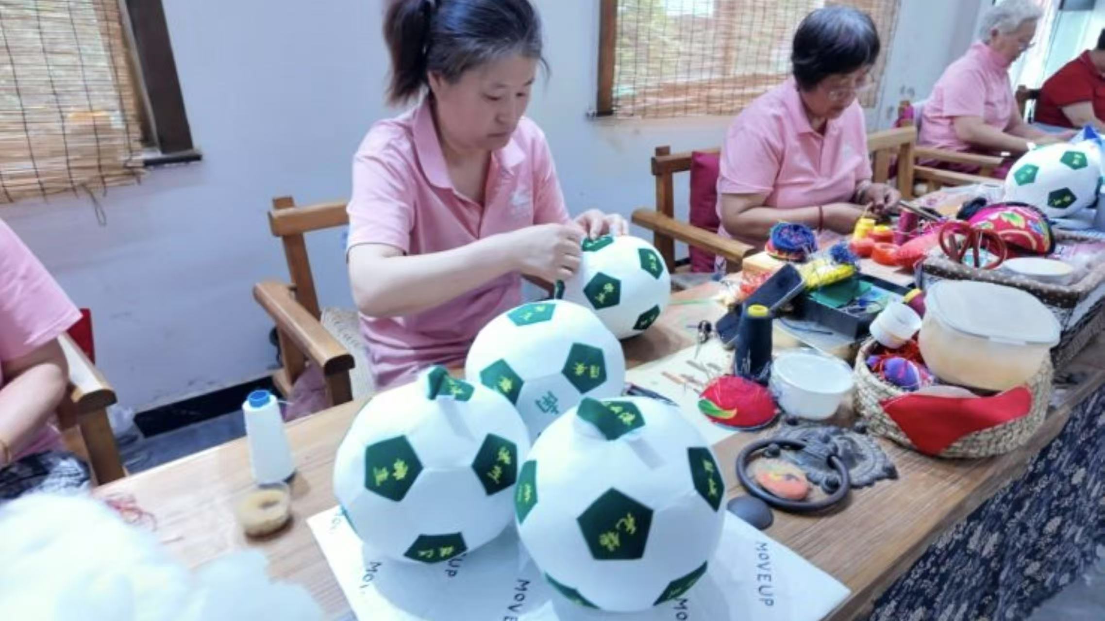 足球上的針線:非遺技藝的“跨界”創新 在香包工坊里的另一處內幾位師傅正圍坐在一起,手中縫制的不是綢緞香囊,而是黑白相間的足球。這是馬莊工坊開發的“蘇超”足球香包項目。從香包的“小而美”到足球的“大而實”,不變的是對“針腳牢固、形態周正”的追求。王秀英老人表示:“手藝不能只躺在過去里,得跟著時代走。”如今,香包不僅有了車載掛件、文創禮盒等新形態,針線活又走進了足球制作,傳統技藝正在以一種新的方式“活”起來。隊員們表示,返回家鄉參與實踐的過程中,更重要的是學習到了這種創新精神,他們希望能將其運用到實際中,為家鄉的文化傳承與發展注入新的活力。
