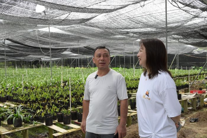 圖為隊員走訪羅布村蘭花基地時,戲揚中國志愿隊指導老師黃艷與村支書交流,對蘭花產業發展、鄉村振興路徑進行深入探討。