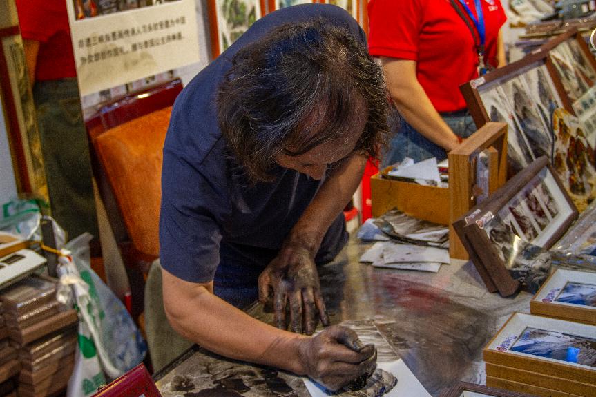 倒帶的影像最終定格在1983年,宜昌一間簡陋的畫室。年幼的習永欽站在父親習超銘身旁。父親寬厚的手掌握住他稚嫩的小手,孩子的食指被引導著,蘸上濃墨,在宣紙上顫巍巍地落下第一道屬于他自己的指痕。這道略顯歪斜的墨線,是一個古老藝術世家的血脈在下一代指尖的蘇醒。團隊在調研中深刻體悟到,正是這最初“手把手”的溫度與傳承的儀式感,奠定了習永欽一生藝術追求的根基。他從七歲起系統學習,在父親嚴苛教導下,從指法、墨韻到心性,磨礪數十載。更可貴的是,他打破“傳內不傳外”的窠臼,廣收門徒二十余人,并創新性地通過網絡直播、小學課堂、國際展覽,讓指墨畫從家族秘技走向廣闊天地。