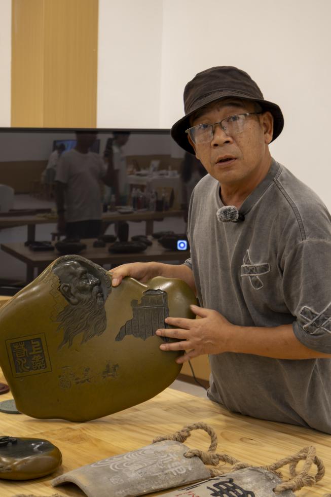 迎面的木案上,青灰色舊瓦與幾件石雕錯落擺放。瓦面經麻繩穿系,帶著經年風化的細紋,石雕則泛著不同石質的溫潤光澤。我們不自覺地放緩腳步,目光在石雕的輪廓與刻痕間流連,指尖幾乎要觸到那凹凸的石面。王志杰老師察覺到身后的動靜,便放下工具轉過身來。隨即俯身托起那尊人物石雕,指尖輕輕拂過衣紋的刻痕,開始向眾人講述石雕的門道:“這塊石材采自山澗,天然石筋順著右側紋路延伸,正好用來刻孔夫子的長髯,不用刻意改動,順著石頭的自然形態就行。石面上的坑洼是天生的,我順勢鑿成竹簡的樣子,讓石頭自帶的紋路成了故事的底子。刻人物用沖刀,下刀穩當才能顯出孔夫子周游列國的氣度;底下車馬用淺浮雕,刀要輕,看起來才有動態。旁邊的字仿漢簡風格,順著竹簡紋路刻,和石頭能融為一體。說到底,就是借著石頭的性子,把孔夫子傳學問、老祖宗說的人與自然相和的道理,用刻痕表現出來罷了。”