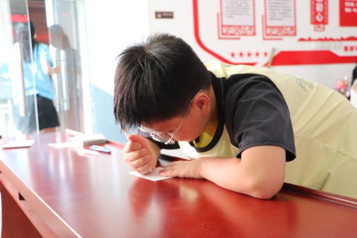 “助殘線”面向三至六年級(jí)的小朋友,難度更高。幾個(gè)體驗(yàn)環(huán)節(jié)中,“筆走書愛”尤為動(dòng)人——小朋友們被要求不使用手指寫下一段話,有的用手掌握住筆,指節(jié)因用力而微微發(fā)白,汗珠順著臉頰滑落,打濕了紙面,卻仍咬著嘴唇一筆一劃地寫,目光里的堅(jiān)定蓋過了疲憊。這親手書寫的艱難,讓他們切身體會(huì)到殘障群體在表達(dá)與創(chuàng)造時(shí),要跨越多少常人難以想象的阻礙。此外,“盲人出行”時(shí),他們蒙眼在五米障礙路線中憑同伴提示摸索,初嘗視障者的出行不易;“盲人購(gòu)物”靠觸覺嗅覺辨認(rèn)物品,才知尋常物件在黑暗中會(huì)變得如此陌生;“聽聲入簍”時(shí)蒙眼投沙包,一次次錯(cuò)過目標(biāo)的茫然,也讓他們體會(huì)到盲人靠聽覺辨向的艱難。