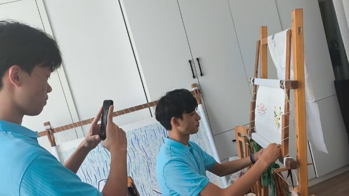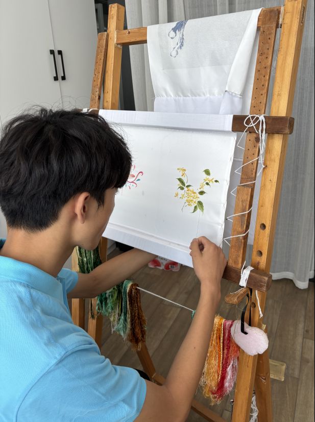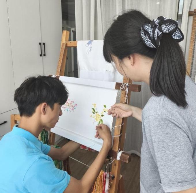 常州亂針繡傳承人孫燕韻老師,金壇刻紙傳承人何雅雯老師,留青竹刻傳承人白雪飛老師并分別在三位大師的工作室中對其進行了專訪,針對“非遺傳承與數字化傳播”“守護傳統與信息化創新”兩個議題同三位老師展開探討交流,取得了高質量采訪成果。在與老師交流學習過程中,成員們由表入里,通過觀察老師們的繡法技巧,體會亂針繡的精妙,并在老師的指導下主動嘗試,“實踐出真知”才能講好非遺故事。