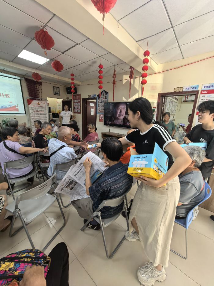 活動開始時,實踐隊成員考慮到老人們的理解能力和接受程度,采取通俗易懂的語言和豐富多樣的形式展開講解。他們先通過一段精心制作的視頻,展示了一鍵報警裝置在實際緊急情況中發揮的關鍵作用。隨后,宣講人潘鈺婷結合PPT,詳細介紹了一鍵報警裝置的功能和應用,同時指出一鍵報警裝置在生活中其實很常見,銀行ATM機旁、無障礙衛生間、地鐵上……都有它的身影。潘鈺婷還通過實例講解,讓老人們更加直觀地理解了一鍵報警裝置的重要性。