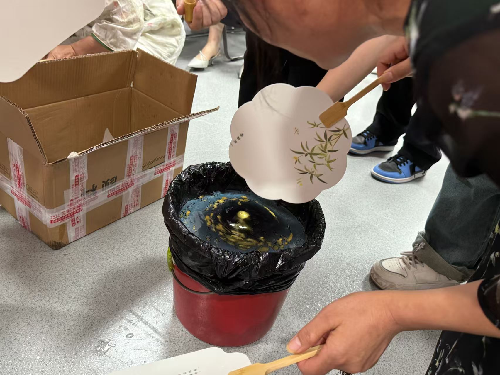 以漆飾扇,情意暗藏作為東方美學的重要物質載體,扇子超越了其原始的納涼功能,其中尤以漆扇最具藝術價值。這類工藝品憑借溫潤似玉的材質特性與深邃瑰麗的色彩表現,歷來受到文人階層的珍視。漆扇制作工藝集中體現了中國傳統漆藝的精髓,通過有機整合繪畫技法、雕刻工藝及鑲嵌技術等多種傳統手工藝,使每件作品都呈現出獨特的藝術特質。在實踐環節中,參與者通過自主調配色彩與繪制扇面的創作過程,深入體驗了漆扇制作的藝術魅力。據志愿者錢女士觀察,一位女性參與者在初始階段對色彩搭配存有顧慮,但在參考經典作品后,最終采用靛藍底色與金粉點綴的創意組合,成品既保持了傳統韻味又彰顯出現代審美趣味;該參與者反復欣賞自己的創作成果時由衷贊嘆:"傳統工藝竟能如此完美地融入當代審美理念"。