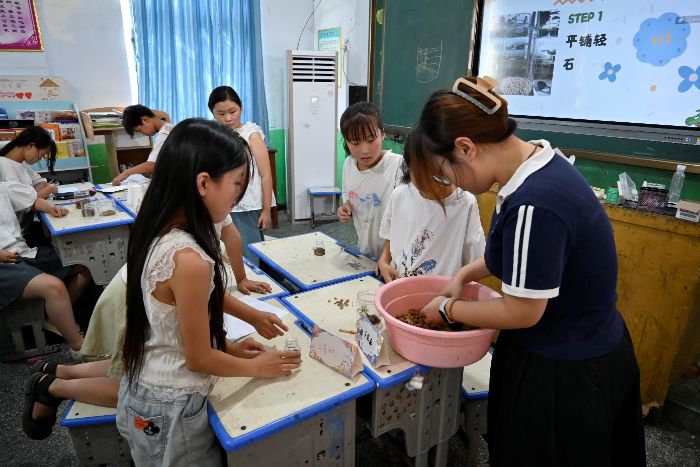 圖為隊員段夢涵和孩子們一齊制作生態瓶黃俊超攝