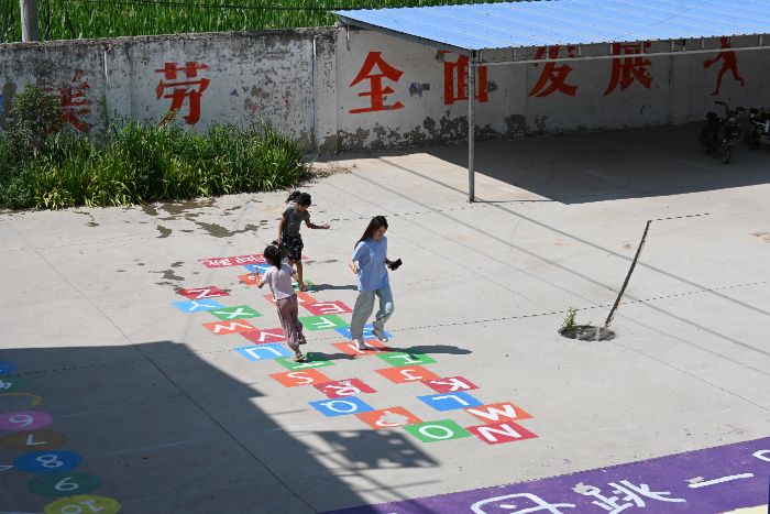 圖為隊員陳艷和孩子們在操場一起“跳房子”段夢涵攝