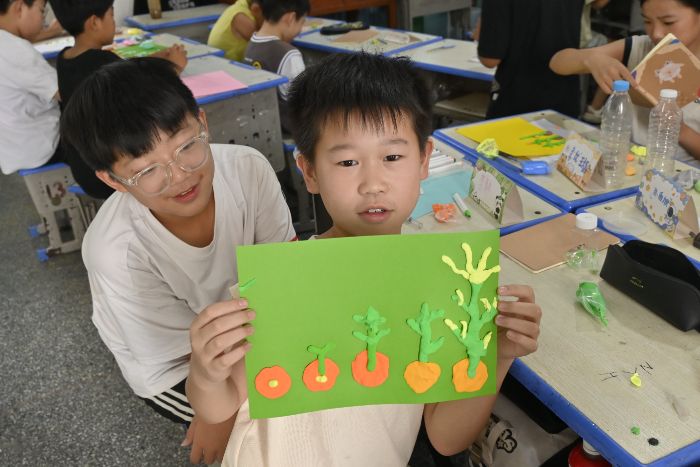 青葵逐日,璞玉成璋 8月8日的結營儀式中,孩子們在隊旗按下彩色手印,象征成長印記;仡櫼曨l歡笑與感動交織,合唱清澈動人。紙飛機在空中劃出弧線,載著孩子們對廣闊世界的向往,為夏日之旅畫上句號。