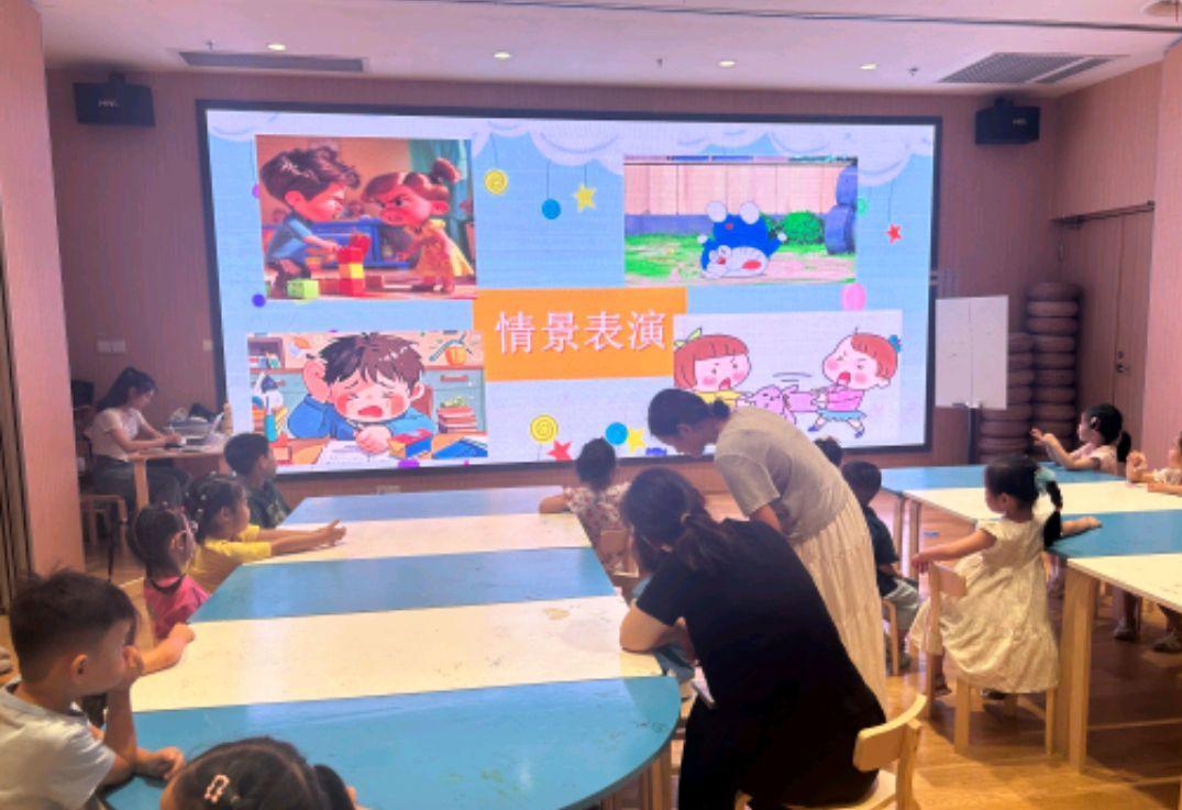 分段授課:你講我幫讓課堂不停歇每天的課程里,2名主講成員輪流上陣,每人負責10分鐘的故事片段講解。一位主講拿起小豬玩偶,邊擺弄邊講“蓋房子”的情節,手里還舉著稻草、積木等實物道具,讓孩子們看得明明白白;另一位主講則配合著切換投影儀上的卡通圖片,講到“吹倒房子(blow down)”時,還特意做了個夸張的吹氣動作,幫孩子們理解意思。旁邊的輔助成員也沒閑著,一會兒遞個道具,一會兒輕聲提醒調皮的孩子坐好。要是發現有孩子眼神飄了,就馬上帶頭玩起“單詞拍手”游戲——說一個單詞拍兩下手,很快就把大家的注意力拉了回來,課堂節奏始終緊湊又活潑。