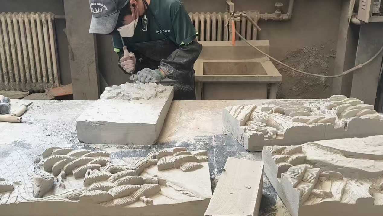 (圖為臨夏青韻磚雕有限公司的磚雕師傅純手工進行磚雕刻畫 劉雅潔 攝)
