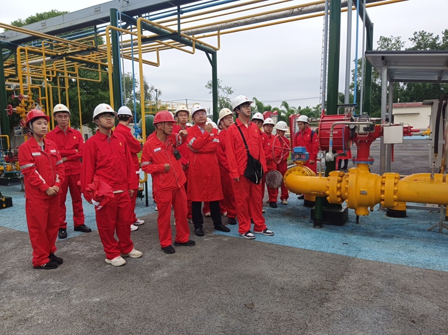 走進現代氣田:平落集氣中心站的數字化實踐 實踐第二階段,隊員們和指導老師在邛崍作業區平落集氣站開展跟崗實習。走進平落集氣中心站,撲面而來的是現代化工業的氣息,智能化巡檢機器人沿著既定軌道緩緩移動,處處彰顯著現代化油氣工業的科技魅力。隊員們跟隨技術人員的講解,從進站安檢開始,逐步了解天然氣處理的完整流程,在高含硫天然氣處理區,先進的脫硫裝置正在高效運轉,在中控室里,巨大的電子屏上閃爍著整個集輸管網的實時數據,值班技術人員指著智能系統解釋道:“這些跳動的數字就是管網的'生命體征',任何一個參數異常,系統都會自動預警”。短暫的跟崗實習隊員們收獲巨大,站內工程師和技術人員嚴謹的工作作風深刻影響了同學們,實踐隊員海洋油氣工程專業2024級本科生鄧旭說到:“作為一名大一學生,自己在學校尚未接觸到很多專業知識,這次實踐讓我們能夠深入油田生產一線,近距離接觸生產設施,為日后專業知識的學習打下了堅實的基礎。”