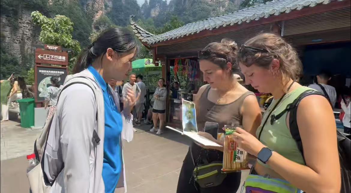 2025年8月4日,團隊在張家界百龍天梯下開展隨機訪談,多位來自歐美、東南亞的游客分享了他們的旅行體驗。“風景美麗,期待更加深入的文化解釋”“希望有更多英文解說和互動項目”——游客們普遍贊賞自然景觀,但也指出語言障礙、文化解讀不足等問題。