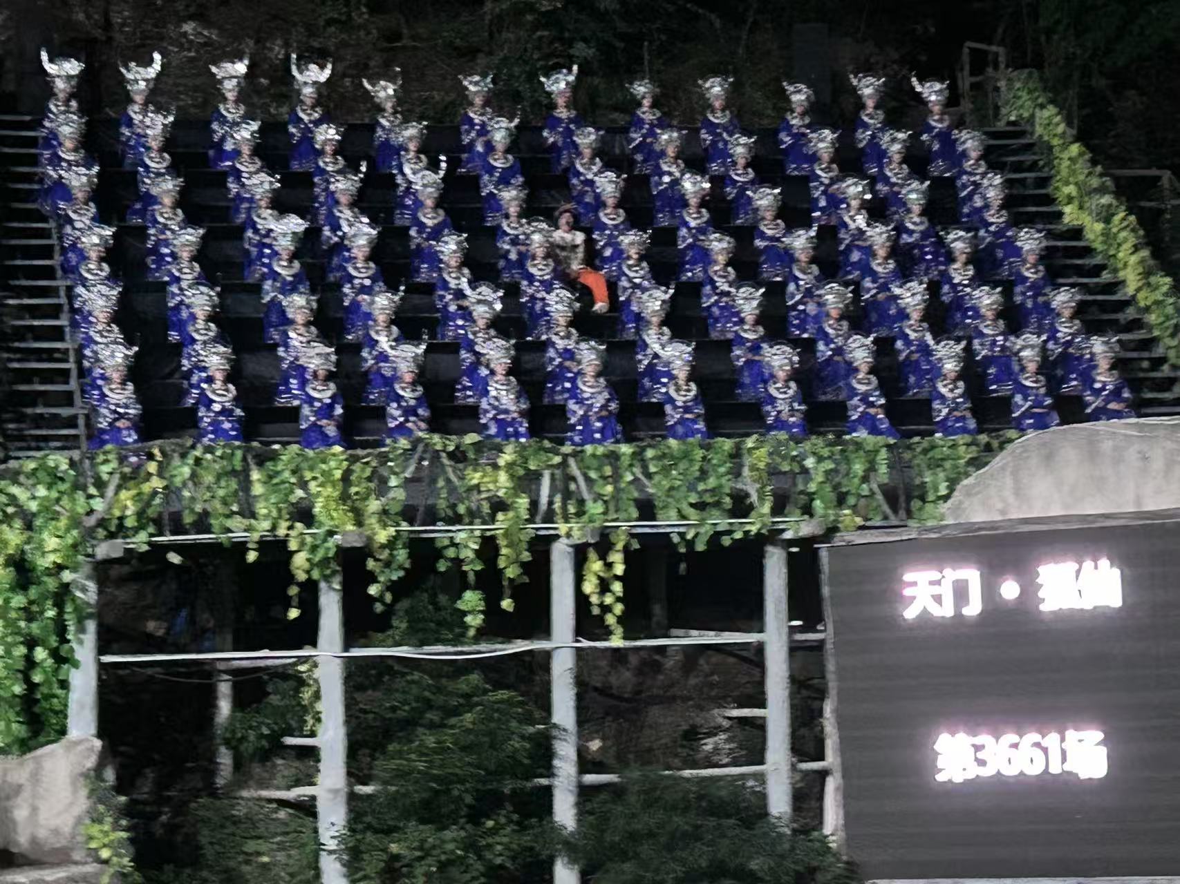 2025年8月3日,調研團隊前往張家界天門山峽谷劇場,觀看大型山水實景演出《天門狐仙》。該劇以土家族民間傳說為藍本,融入苗族歌舞元素,通過光影技術與自然山水的完美結合,展現出一幅跨越民族、時空的文化畫卷。隊員們了解到,該演出不僅吸引大量國內游客,也逐漸成為入境游客了解湖湘文化的重要窗口。