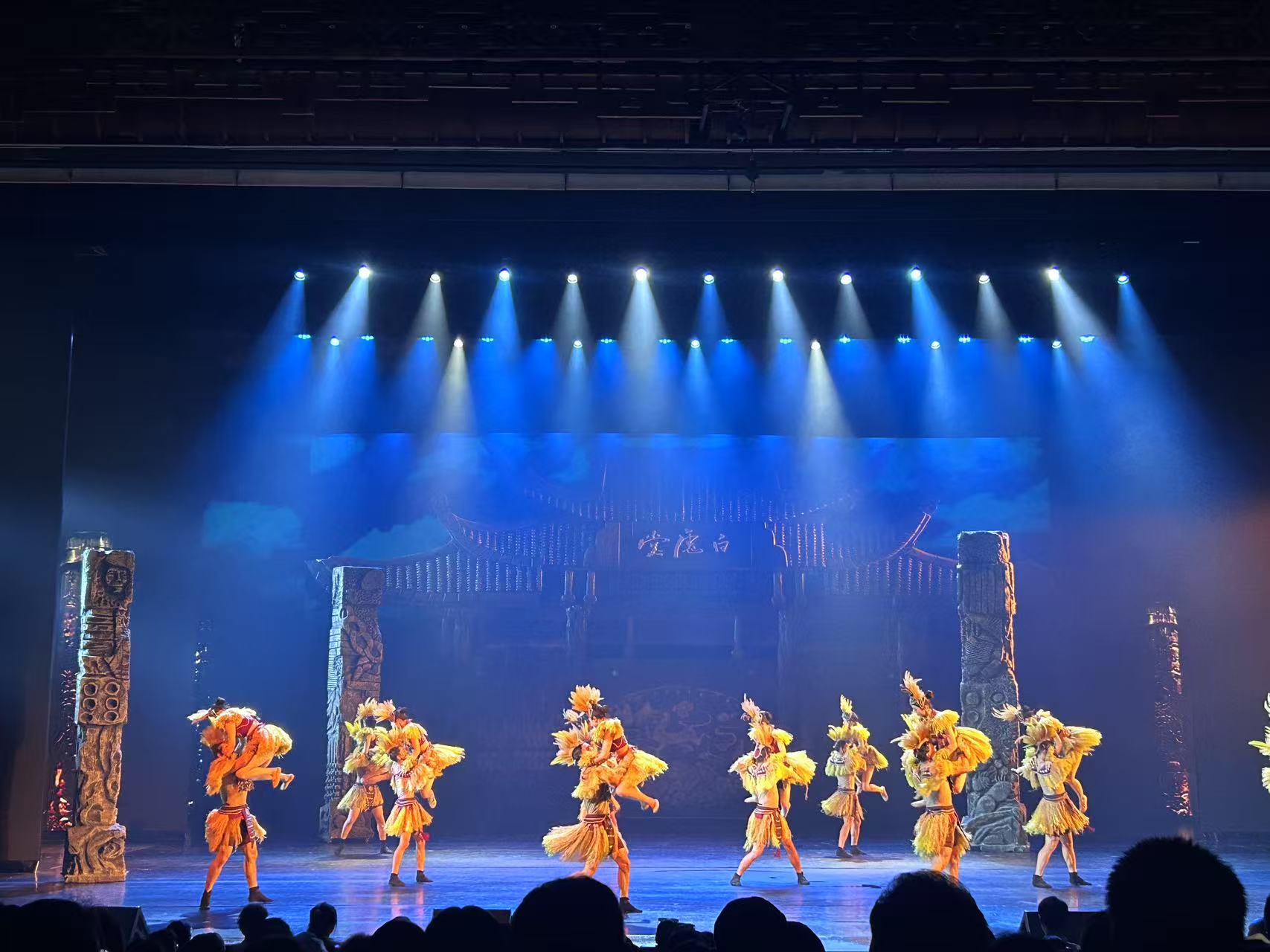 次日,團隊又走進《魅力湘西》劇場,深入調研土家族與苗族文化的舞臺融合實踐。《魅力湘西》以其恢弘的場面、濃郁的民族風情和精湛的表演技藝,成功將茅古斯舞、擺手舞、苗族銀飾舞等非遺項目推向國際舞臺。同時,劇場設置了電子屏實時將對話與歌曲翻譯為英文與韓文,通過民族文化的現代表達,增強了入境游客的文化體驗感和認同度。