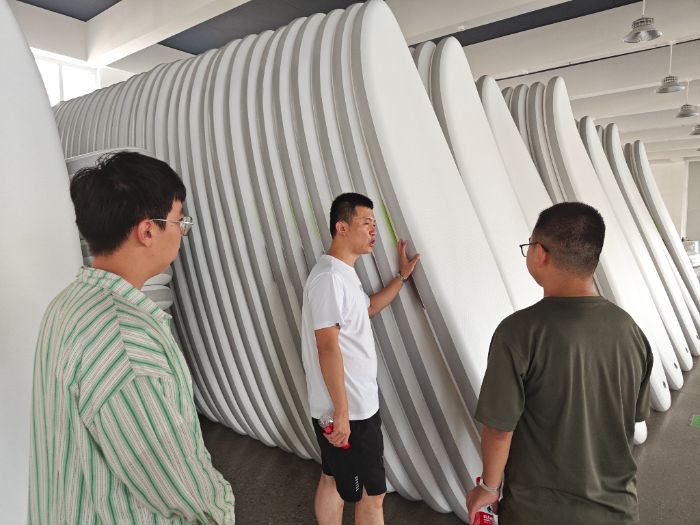 進入公司,研發(fā)部部長熱情接待隊員們并主持座談會。隊員們詳細匯報了大學生創(chuàng)新創(chuàng)業(yè)訓練計劃項目“充氣式槳板的力學性能研究”的研究內(nèi)容,重點介紹了通過結構優(yōu)化提升槳板抗沖擊性的實驗數(shù)據(jù)與模擬結果。企業(yè)技術團隊對項目的前沿性和實用性表示肯定,認為其研究方法可為產(chǎn)品耐候性改進提供參考。雙方就材料復合工藝、膠層附著力測試等具體問題展開討論,并約定后續(xù)開展聯(lián)合實驗。