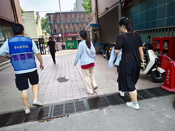 團隊記錄了社區內多種植物,如欒樹、丁香、圓柏、山杏、碧桃、懸鈴木、玉蘭等,觀察植物形態、是否有吊牌以及適老化優勢與不足。他們希望通過合理的植被配置,為老年人提供更舒適、安全的活動空間。調研團隊檢查社區內道路是否適合老人行走,是否有坡道等。他們發現部分社區的步道存在坡度過大、路面不平等問題,給老年人的出行帶來不便。