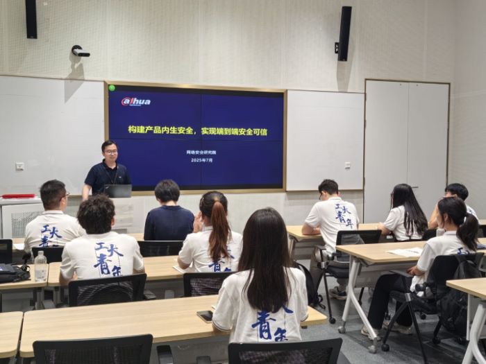7月8日,實踐隊走進大華股份,公司招聘經理丁迪系統介紹了公司的戰略布局、企業文化及校招崗位需求,并強調期待與高校深度合作,共同培養網絡安全人才。網絡空間安全首席科學家張劍青以《構建產品內生安全,實現端到端安全可信》為主題,為實踐隊員進行了前沿技術分享。