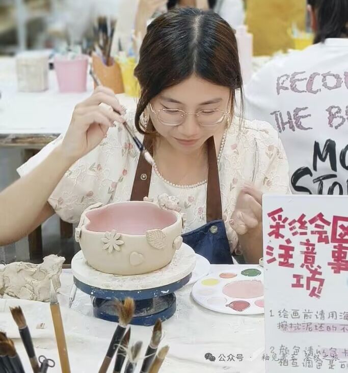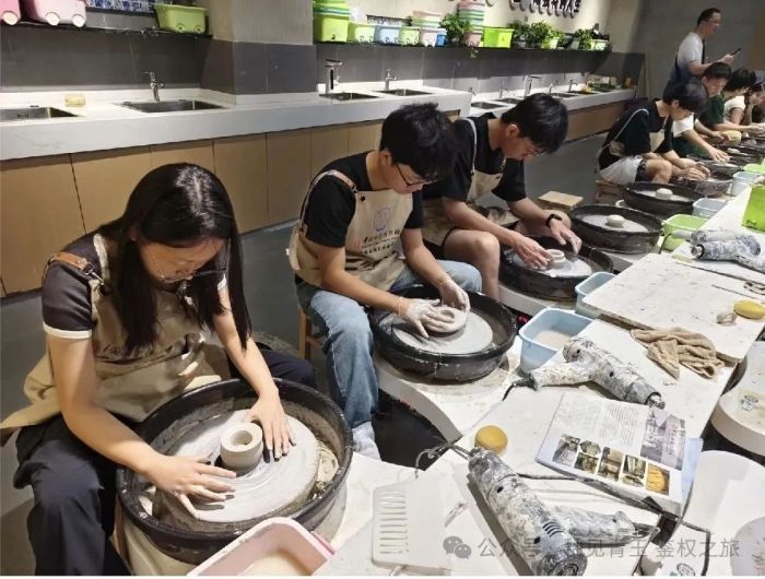 陶瓷手作坊,沉浸式感受陶瓷從泥到器的升華歷程。雙手沾著泥土,成員們嘗試揉泥、拉坯、修坯、刻畫、釉下粉彩——每一道工序都需要耐心與協作。有隊員在一次次失敗中感慨:“原來每一道曲線、每一筆紋樣,都是來之不易的。”