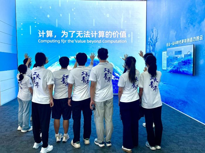 此外,講解員著重介紹了阿里云的大模型產品“通義千問”“通義萬相”以及“魔塔社區”AI體系,同學們深入了解了阿里云在科技前沿大模型方面的研究歷程及產出成果。通過參觀展廳,同學們深刻體會到了阿里云“計算,為了無法計算的價值”的核心理念。