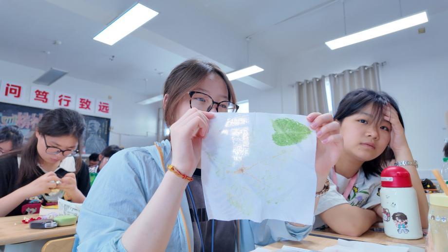 面向阜寧縣陳集中學的學子,團隊精心設計了兩大創意工坊。“卡紙筑夢夏境,創意解鎖維度”工坊以卡紙為媒,鼓勵學生們在幾何分割與色彩碰撞中,構建心中獨特的夏日自然景觀,開啟對空間美學的深度探索。而“草木為媒,拓染心靈”植物拓染課,則引導青年學子在一錘一印的敲打間釋放壓力,讓草木的天然形態與色彩永恒定格于布帛之上。