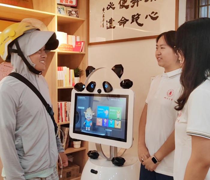 “小牛哥・剎一腳”愛心智慧驛站自2021年在成都市委組織部指導下建立,2022年投入使用,是新就業群體24小時不打烊的“暖心服務站”和“溫馨港灣”。目前,四川省成都市錦江區已建成41個此類驛站,為外賣員、快遞員等提供19項貼心服務。實踐團成員實地參觀了“小牛哥・剎一腳——宏清站”,這里不僅設有“愛心冰柜”——在夏季為戶外工作者提供冰鎮飲用水,咖啡機、飲水機、冰箱、空調、微波爐等設備一應俱全,還有常用藥品、應急雨衣等暖心物資;而且,驛站還引入智能機器人,為“小牛哥”提供法律援助、政策咨詢等服務,科技管家實現全天候值守,讓新就業群體隨時可享服務。